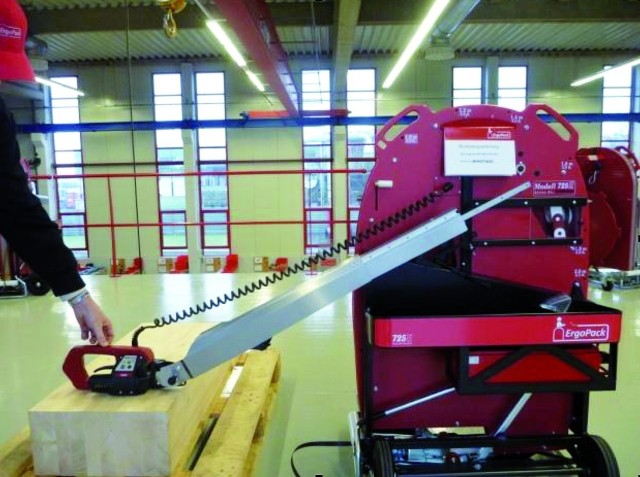 I sistemi di reggiatura ErgoPack consentono all’operatore di effettuare la reggiatura di bancali in modo sicuro, semplice ed ergonomico. La lancia a catena scorre a terra tra le assi del bancale per poi salire ed accompagnare la reggia tra le mani dell’operatore.