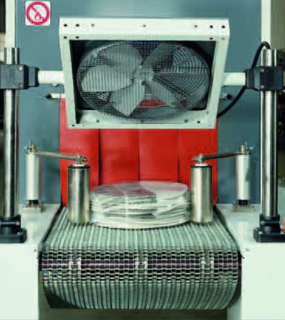 Adatta per confezionare con film termoretraibile al polyethylene "flat sheet". Il prodotto arriva alla macchina e viene affardellato con del film (con i rulli superiori e inferiori) e trasportato da un nastro trasportatore motorizzato.