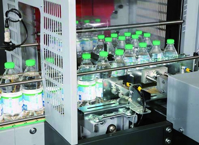 Impianto monoblocco a fardello con alimentazione motorizzata a 90° e gruppo spintore pneumatico con programma sequenziale. Per la formazione di fardelli realizzati con film di polietilene termoretraibile.