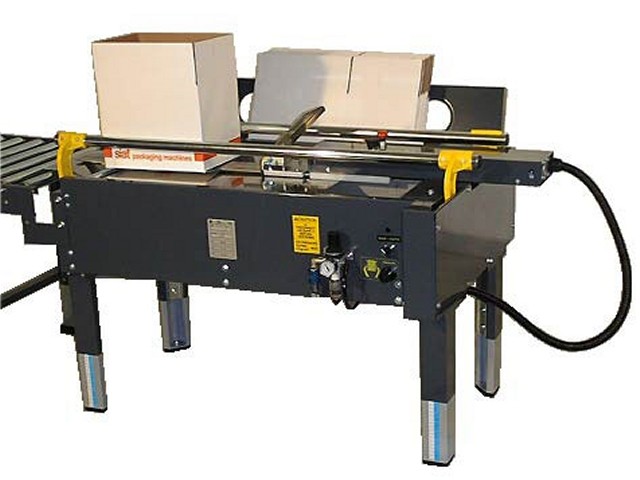 Spingendo la scatola verso la nastratrice le falde laterali inferiori azionano un circuito pneumatico che realizza la chiusura delle falde laterali stesse.
