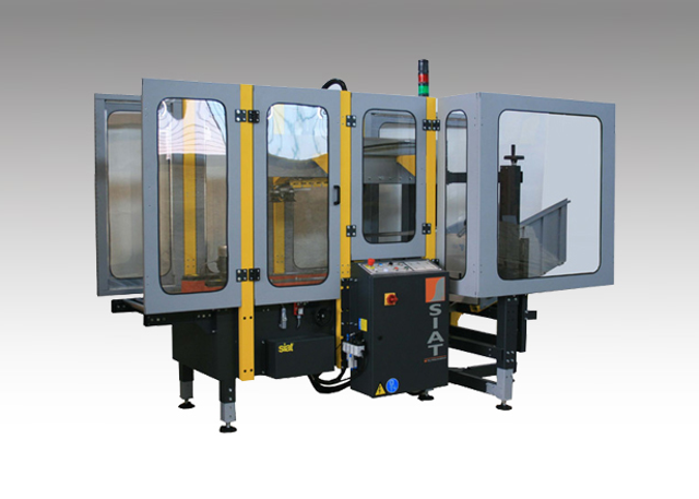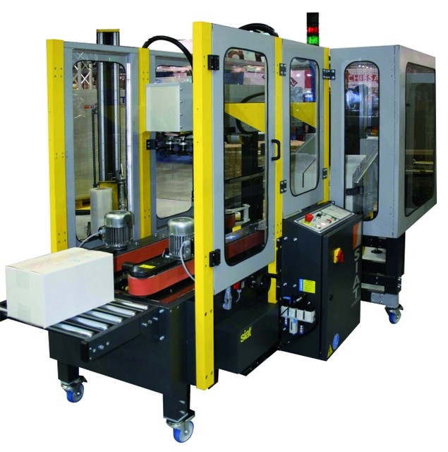 Formatore Automatico. Chiude le falde inferiori con nastro adesivo. Regolabile manualmente per scatole di dimensioni diverse. Magazzino a gravità per 150 scatole. Il magazzino è in linea con le cinghie di trascinamento e le unità nastranti. Il Carrello viene mosso per aria compressa (SMC + BOSH – Festo su richiesta) tramite delle ventose che prendono la scatola piatta dal magazzino, la formano e la spingono tra le cinghie di trascinamento motorizzate ( n.2 motori HP 0,18/cad) mentre le falde inferiori vengono piegate e nastrate dalla K11 (o K12 su richiesta) Sistema Ventury. La macchina è controllata da un PLC (Omron – o altri brands su richiesta) che sincronizza i diversi movimenti della macchina e armonizza altre macchine eventualmente connesse (riempitore scatole, rulliera, nastratrice ect.). Le barriere di protezione sono equipaggiate con interruttori per disconnettere il sistema elettrico e pneumatico nel caso siano aperte.