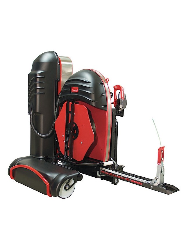 Sistema Ergonomico di reggiatura di bancali in verticale. L’ErgoPack Air è un sistema completamente elettronico, come nei modelli standard la catenaria si movimenta tramite joystick e il sistema è alimentato da batteria che garantisce dalle 150 alle 400 reggiature per carica. Il Convogliatore ErgoPack Air 725-580/740-580 dispone di un pannello comandi, molto semplice da utilizzare, creato pensando all’esigenze dell’operatore. Con il Convogliatore ErgoPack Air 725-580/740-580, ad esempio, possiamo selezionare la quota d’altezza per l’uscita della doppia catenaria oppure selezionando l’apposita modalità Load (caricamento) l’operatore viene guidato in 8 semplici passi per cambiare la bobina. I materiali tecnici con cui è fabbricata la catenaria la rendono molto resistente ad urti ed usura. Incluso nel sistema ErgoPack Air 725-580/740-580 troviamo il braccio Triplex Tool-Lift che sostiene il tendireggia su cui è montato. Questo braccio, azzera il peso e le vibrazioni del tendireggia, ne rende nettamente più sicuro e agevole l’utilizzo. Come per i modelli standard dei convogliatori ErgoPack 725E/740E anche con il convogliatore ErgoPack Air 725-580/740-580 la differenza tra i due modelli sta solamente nel tendireggia che montano: entrambi sono tendireggia termosaldanti di ultima generazione di fabbricazione. Il convogliatore modello Ergopack Air 725-580 monta un tendireggia ORT-250 compatibile con reggia da 9,00 mm a 16,00 mm PP e PET e forza massima di tensione 2500 N. Il convogliatore modello Ergopack Air 740-580 monta il tendireggia ORT-400 compatibile con reggia da 16,00 mm a 19,00 mm PP e PET e forza massima di tensione 4000 N. Con l’ErgoPack Air lo spazio minimo tra le assi del bancale deve essere di circa 60 mm.