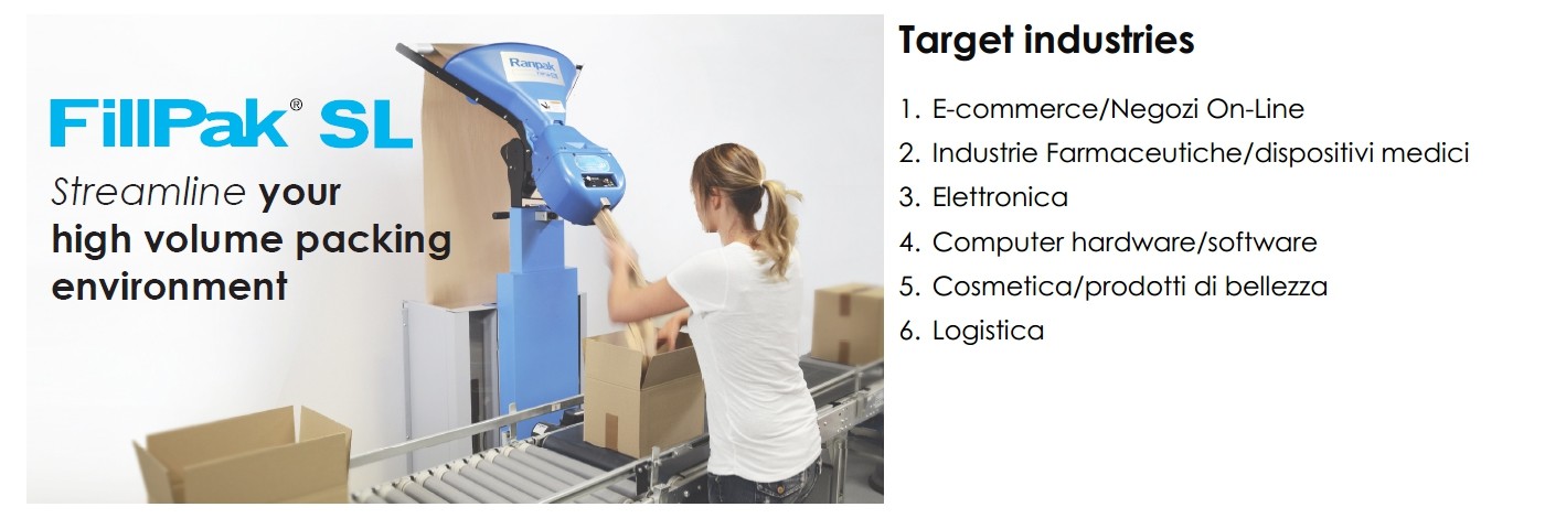 Il sistema di carta FillPak®SL aiuta a migliorare la produttività e l'efficienza riducendo i costi per pacco e riducendo al minimo l'impatto sull'ambiente. Il sistema di carta FillPak®SL è un sistema molto versatile e può essere utilizzato in tutte le situazioni. Il FillPak SL permette all'operatore di riempire rapidamente ed efficacemente pacchetti mantenendo l'attenzione sul processo di riempimento. Le opzioni di controllo consentono all'operatore di riempire con un flusso conveniente e coerente di carta. La possibilità di regolare la testa del FillPak SL in altezza o in inclinazione pemette di soddisfare al meglio qualsiasi esigenza dell'operatore creando una postazione di lavoro confortevole e produttiva.