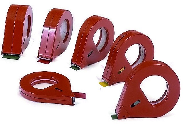 Distributore di nastro adesivo in metallo, idoneo all’applicazione di nastri di piccole dimensioni.